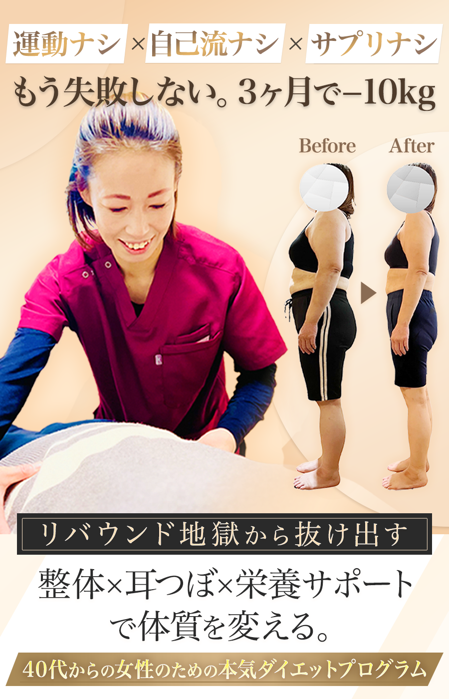 そんな私が最後に出会ったのが、 「運動ゼロ・肋骨矯正整体と無理のない食事プランで体から整える」ダイエットでした。