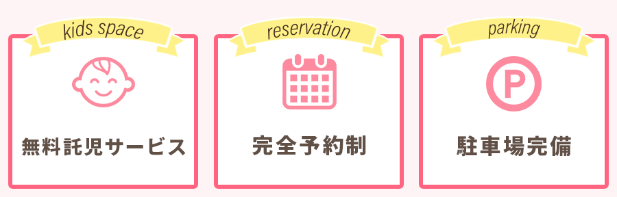 当院では、”赤ちゃん連れ”のママさんが気軽に来れるように「完全予約制」や「無料の託児サービス」など環境を整えております。